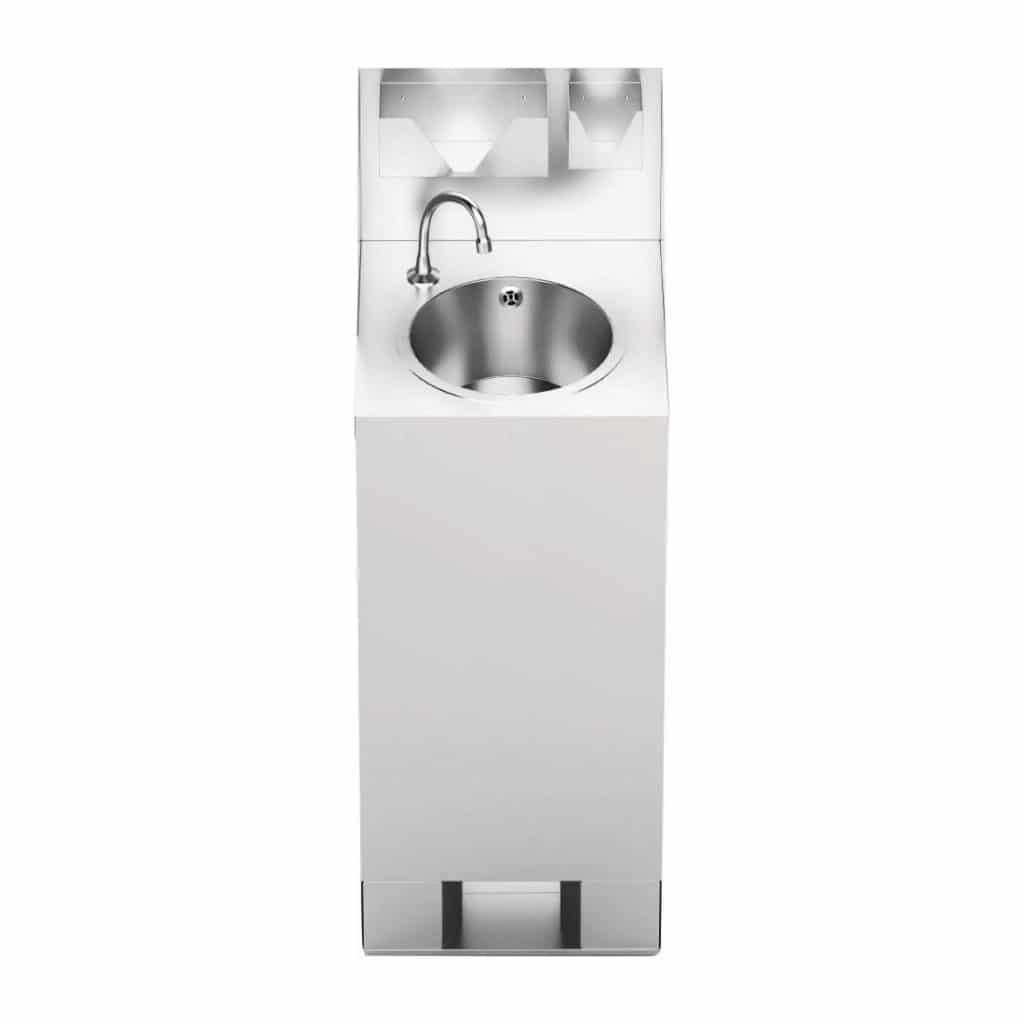 The sturdy, stainless steel unit comes with accessories – an integrated splash back and a built-in soap holder and towel dispenser, all of which are easy to wipe clean. The station is mounted on large wheels for quick and easy manoeuvring.
