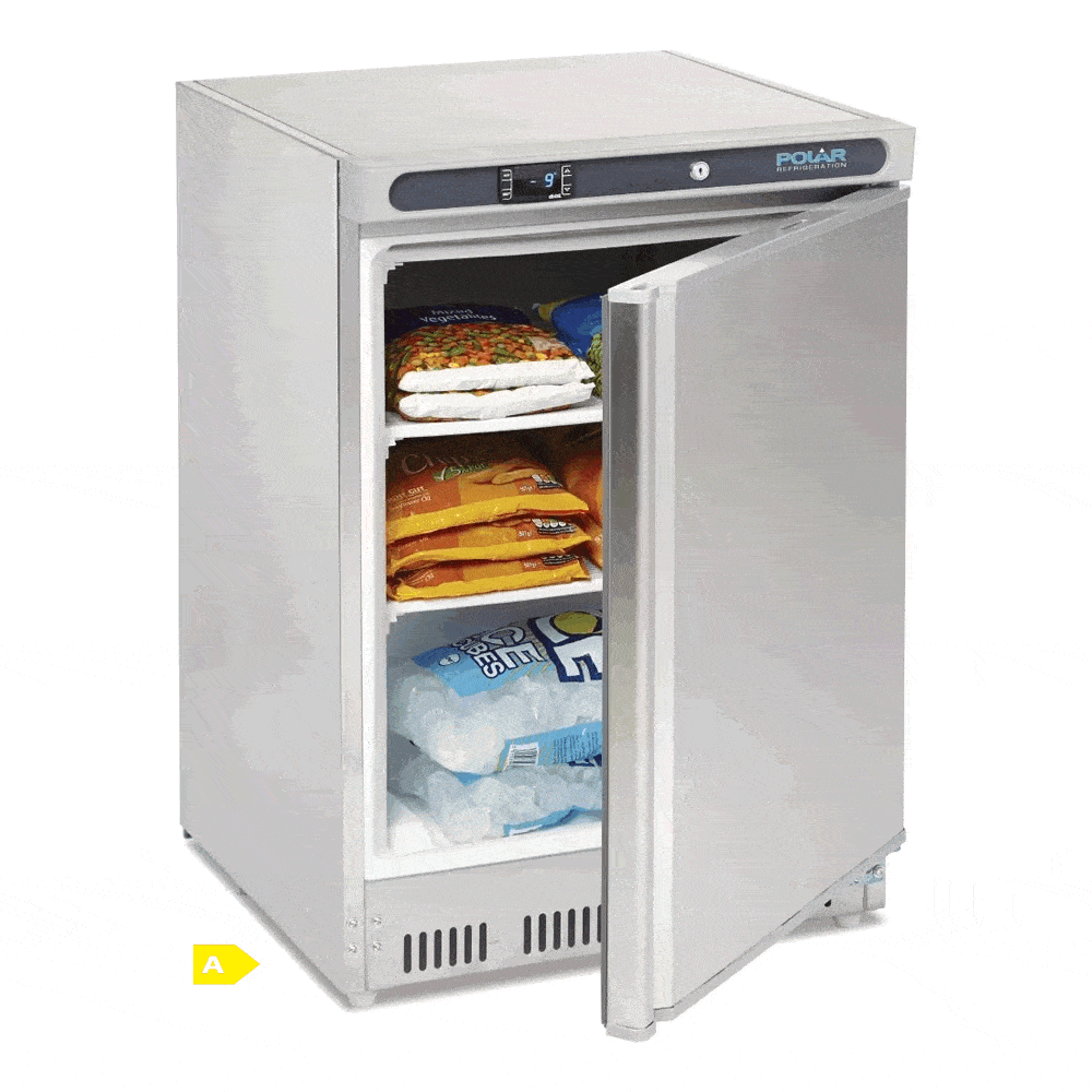 Under counter stainless steel freezer. A-rated efficiency freezer is ideal for less demanding commercial kitchens or areas with limited space. With three sturdy fixed shelves, there’s plenty of space for generous quantities of frozen ingredients, whilst stainless steel construction ensures the freezer is incredibly strong and quick to clean.